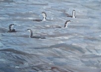 Two Black-throated and three Great Northern Divers painted during a windy afternoon in Blakeney Harbour.15th January 2014